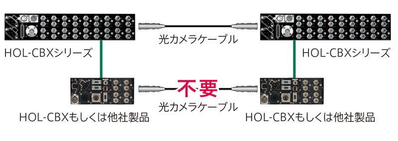 1芯ダークファイバで構築されたHOL-CBXシリーズに別の製品を光多重して拠点間を光1芯で伝送可能です。