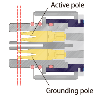 A sequence structure is employed whereby the grounding pole comes in contact first when connected. This allows the connector to be plugged and unplugged safely even when the power is on.